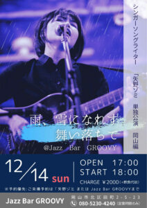 | 4日 | 土曜日 | 15:00~20:00 | 【GROOVY Live】おかやまジャズ・ストリート(16:30~19:30) ※店主は幸町パラディで演奏です。(21:00~) |