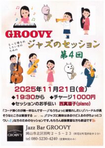 | 4日 | 土曜日 | 15:00~20:00 | 【GROOVY Live】おかやまジャズ・ストリート(16:30~19:30) ※店主は幸町パラディで演奏です。(21:00~) |