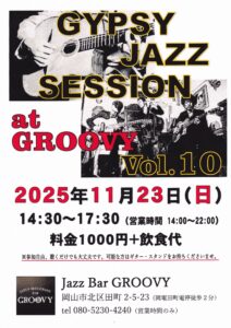 | 23日 | 日曜日 | 14:00~22:00 | 【GROOVY Event】ジプシー・ジャズ・セッションvol.10(14:30~17:30) |